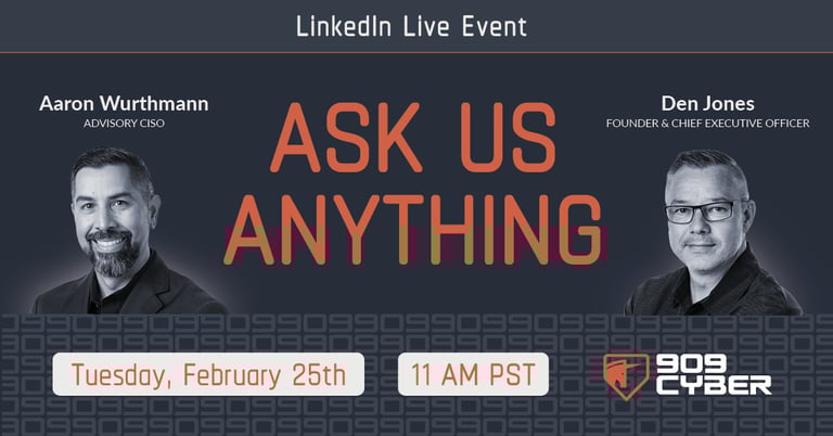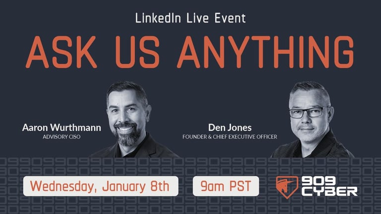 Join Founder & CEO Den Jones & Advisory CISO Aaron Wurthmann for an engaging LIVE session where you can pose your questions and gain insights! Explore a wide range of topics encompassing cyber security, risk management, and leadership.